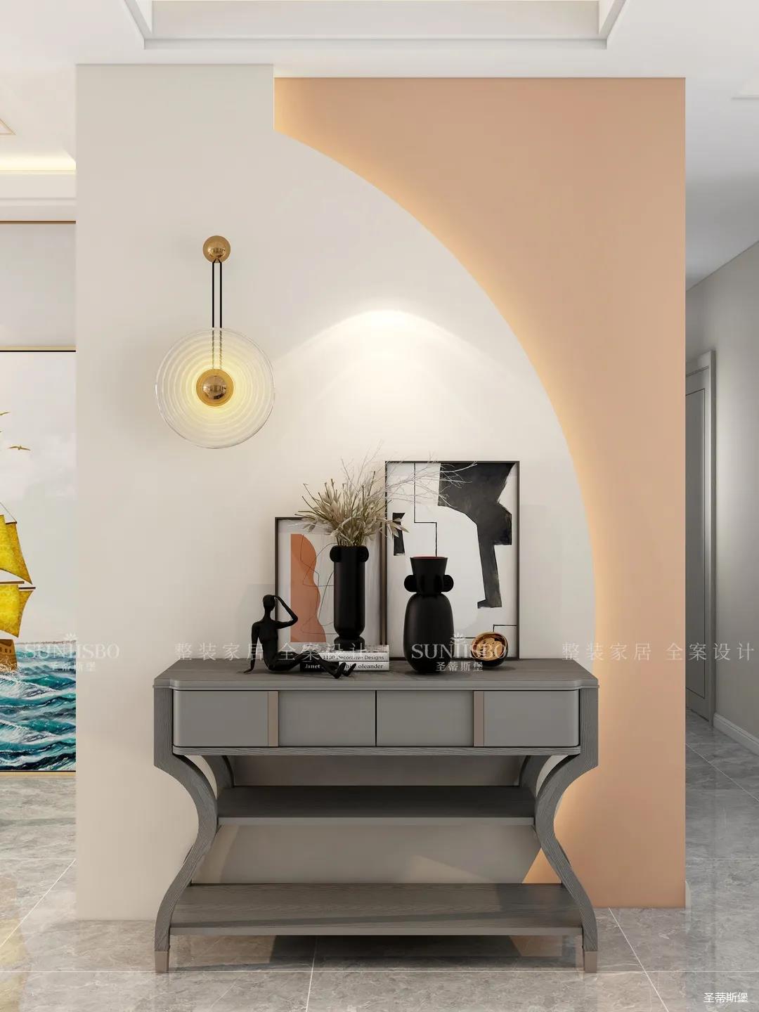 入户玄关立体抽象装饰物的摆设,和几何艺术画相互搭配,艺术感满分。黑白色的经典搭配凸显质感,浅橙与白色墙面间安装灯带,既温暖了入户氛围,也增加了空间的层次感。